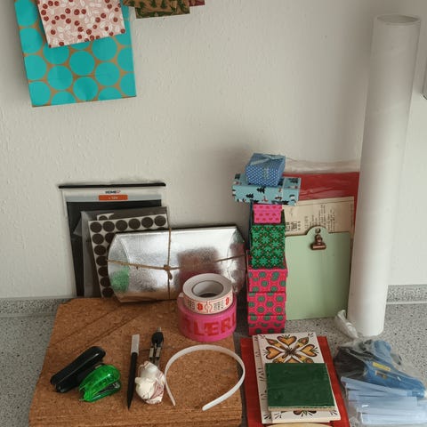 Blandet hobby- og scrapbooking sæt med sakse, hul tang, tape og mapper