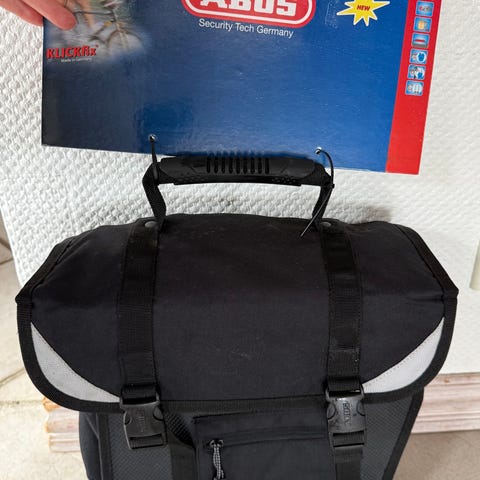 Velfungerende cykeltaske med adskillige rum med lynlås. Tasken monteres på siden af cyklen. Der er desuden plasthætte til beskyttelse af regn.
