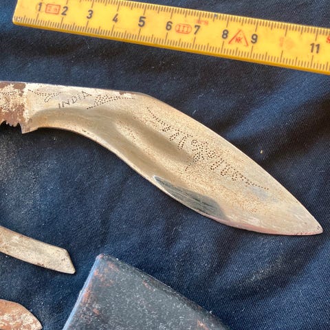 Pibe med organisk formet træskaft og flere metalbånd som dekoration og forstærkning. Mundstykket er i rav materiale med indlagte nuancer. Piben fremstår som et håndlavet eller ældre stykke, velegnet som rygepibe eller som dekorativ samlergenstand. Nærmere mål, træsort og materiale på mundstykket er ikke angivet.