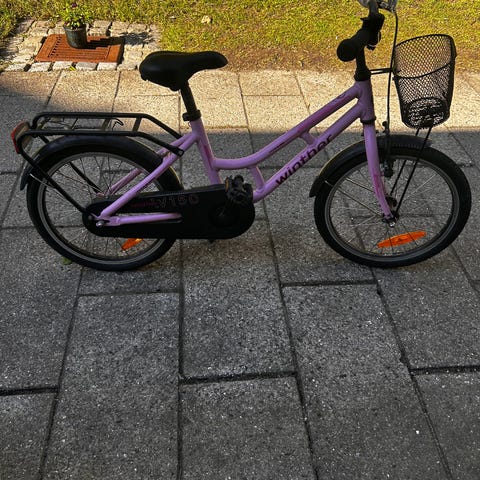 Kildemoes børnecykel med 18" hjul i lilla farve. Cyklen har lav indstigning, kurv foran og bagagebærer bagpå. Den er udstyret med kædeskærm, støtteben og reflekser. Sadel og styr kan justeres i højde, så cyklen kan tilpasses barnets størrelse.