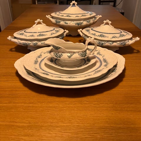 Sælger dette utroligt smukke og velholdte stel fra engelske Wedgwood i serien Lavender (Etruria & Barlaston). Stellet står i den helt rigtige sarte, lyseblå farve, som giver et dækket bord et både klassisk og moderne udtryk.