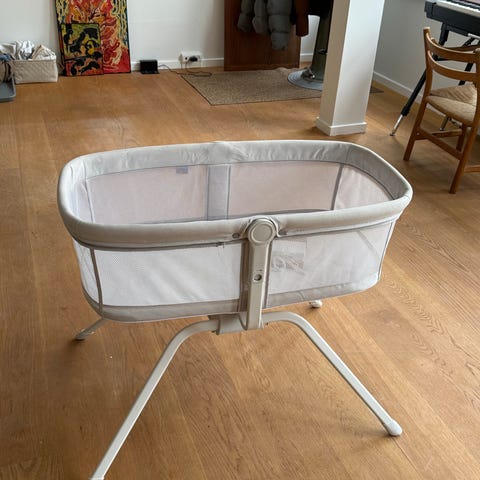 Chicco bedside crib babyseng i grå tekstil. Sengen er beregnet til brug som side-by-side seng ved forældrenes seng. Den har bløde tekstilkanter og netpanel i siden, som giver udsyn til barnet. Velegnet til spædbørn, der skal sove tæt på forældrene, men i egen seng. Kan anvendes som sovested om natten eller til lure i løbet af dagen.