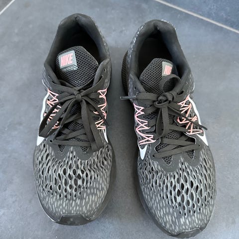 Nike sko i str. 40. Skoene er i en lys beige farve med pink Nike-logo og detaljer. Overdelen er i tekstil og syntetisk materiale med mesh-paneler, som giver åndbarhed. Ydersålen er i gummi med mønster for greb. Velegnet som løbesko eller til hverdagsbrug.