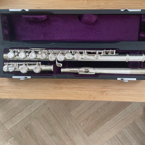 Tværfløjte fra Gemeinhardt med etui. Fløjten leveres adskilt i mundstykke, midterstykke og fodstykke og ligger i et foret hårdt etui med blå indvendig polstring og sort yderside. Egnet som instrument til både øvebrug og spil i ensemble eller orkester.