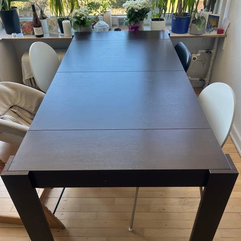 Brugt spisebord fra IKEA med 4 stole og tilhørende 2 tillægsplader. Bordet har synlige brugspor i den ene ende og i den anden ser det fint ud. Stolene ser meget fine ud