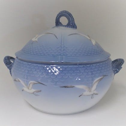 Stor - 15 x 23 cm. - flot lågkrukke / skål , "håndtaget" på låget er en slørhale / fisk.