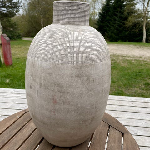 Vasen har en mat, mørk overflade med let patineret udtryk. Egnet som gulvvase til grene, tørrede blomster eller som dekorativt element i stuen, entreen eller andre rum i hjemmet.