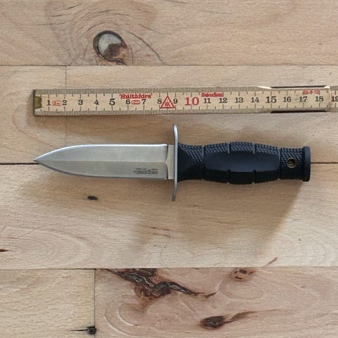 Cold steel taktisk kniv med sort klinge og sort håndtag i Carbon stål . Kniven har dobbeltægget klinge og leveres med hård plastskede med bælteophæng.