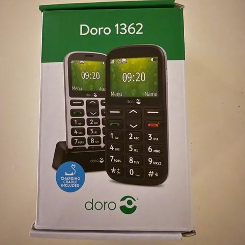 Doro mobiltelefon i rød farve. Klassisk mobiltelefon med fysiske taster og farvedisplay. Velegnet til enkel telefoni og sms. Understøtter 4G ifølge emballagen og leveres med opladerstation som vist på billedet. Egnet til brugere, der foretrækker store taster og overskuelig betjening.