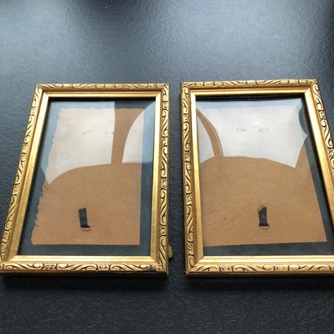 To små fotorammer i guld og hvid med glas