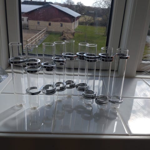 Samlet pris for alle tre. Stagerne kan stables og sammensættes på forskellige måder. Hvert modul har tre lyspladser og runde kugleformede samlinger.