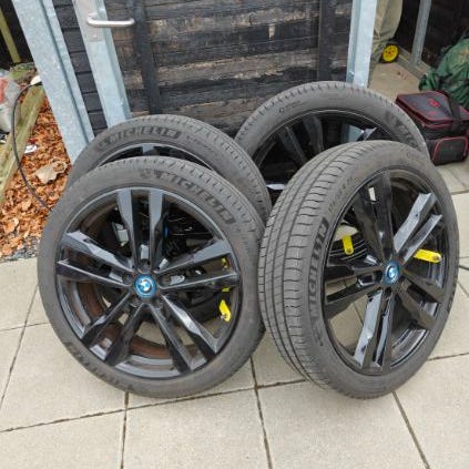 4 sorte alufælger - til BMW i3. Inkl. 4 vinterdæk, mrk. Nokian. 2 fordæk bør skiftes. Ellers velholdt og ok