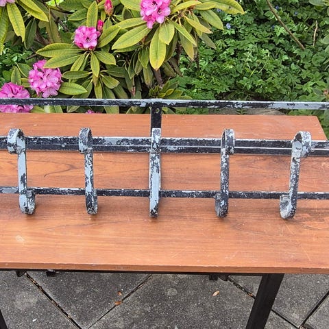 Holderen er udført i kraftigt metal med galvaniseret overflade og dekorative buede beslag. Konstruktionen giver plads til én lang eller