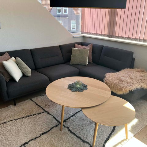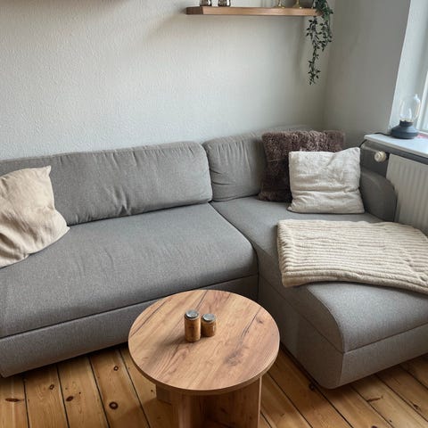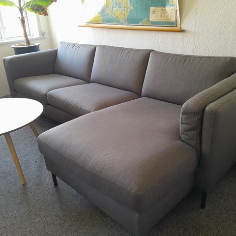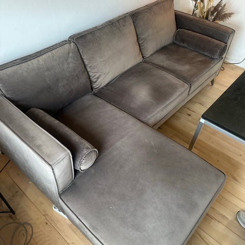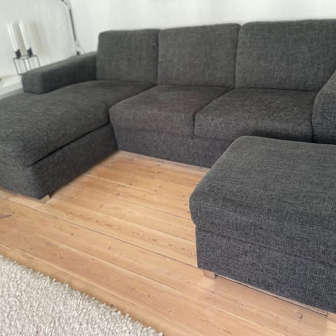 Sofa med chaiselong i mørkbrunt stof. Sofaen har en hjørneopstilling med chaiselong i den ene side og faste sæde- og ryghynder. Den står på lyse ben og er egnet som sofa til stue eller opholdsrum. Farven er neutral mørkbrun, som passer ind i mange indretningsstile. Puder og øvrigt tilbehør på billederne er ikke en del af selve sofaens faste udstyr., Fra ikke ryger hjem. Der er ingen huller eller pletter på sofaen. Alt betrækket er aftageligt og kan vaskes. Vi skal flytte og huset skal ryddes, derfor den lave pris.