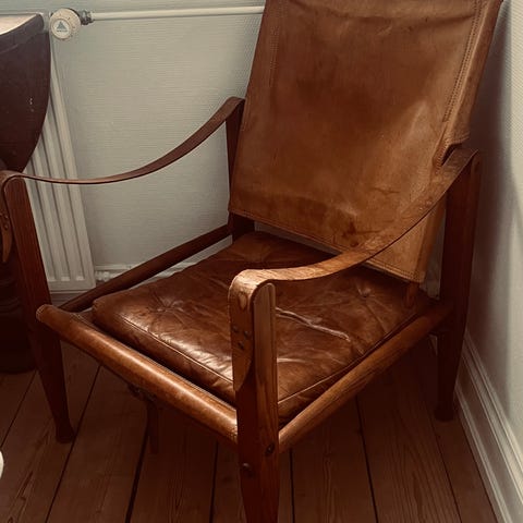 Jeg sælger denne safari stol og prisen er sat efter at den er gået lidt i stykker(se billede). Den kan uden tvivl repareres, eller der kan sættes noget sort tape på (i stedet for det grå som på billedet). Den er stadig rigtig fin at sidde i.