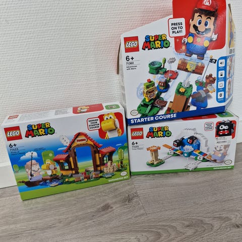 I kasserne er de sæt der er vedhæftet billeder af. Delene til Bowsers luftskib er særskilt i den ene kasse. Alle manualer kan tilgås via en gratis app eller findes online. Vi kan ikke garantere at alle klodser er der (men næsten) - derfor den lave pris. Alle figurer virker med lyd og elektronik, så legen kan integreres med app'en, hvis man ønsker