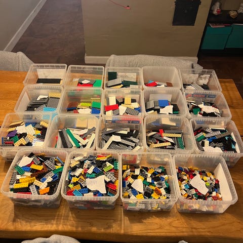Det er ca 500gr Lego i hver pose