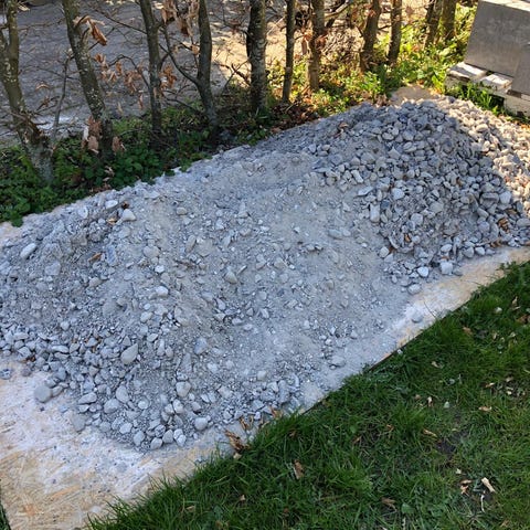 Jeg vil tro, at der er omkring 400 kg tilbage eller en trailerfuld. Står i en forhave - lige til at hente og trailer kan køre helt frem (næsten).