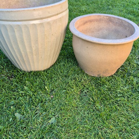 Sæt med tre havekrukker i keramik i sort glasur. Krukkerne har rillede sider og drænhul i bunden. Størrelserne varierer, som vist på billederne med tommestok, og egner sig til beplantning med blomster, krydderurter eller mindre buske på terrasse, altan eller i have.