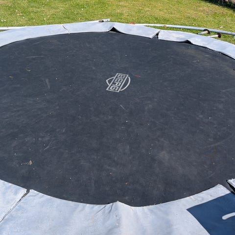 Trampolin 425 cm. med sikkerhedsnet og stige , jeg hjælper med at adskille , kan være på trailer, jeg har taget dugen og sikkerhedsnettet af her i vinter.