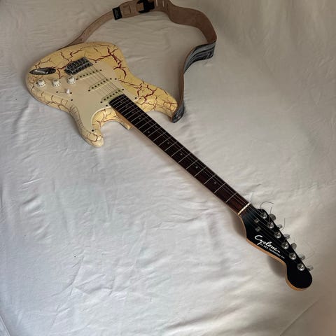 virkelig flot og fin guitar, jeg har justeret den skiftet strenge og olieret gribebræt, den har wilkinson pick ups. de koster alene nok mere end guitaren er til salg til. lyder fedt og er utrolig let at spille på, ikke en elendig begynder guitar,