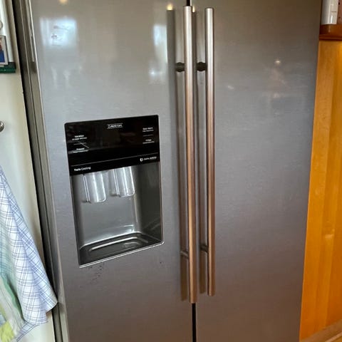 Samsung køleskab med vanddispenser og isterningefunktion. Fungerer som det skal, så man altid kan tage et glas koldt vand med knust is eller isterninger.