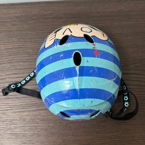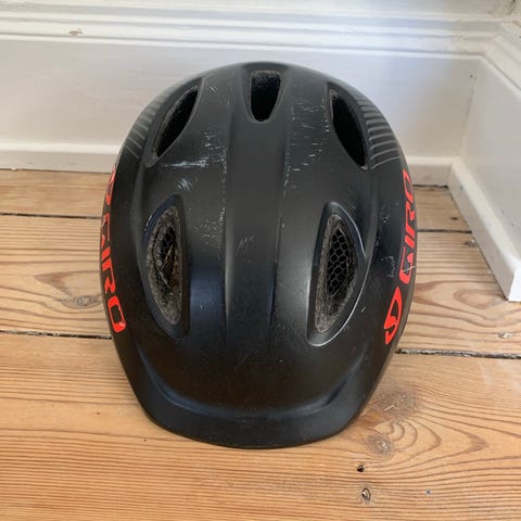 Bell cykelhjelm i sort farve. Hjelmen har flere ventilationshuller og en hård yderskal. Indersiden er polstret for komfort. Ydersiden er dekoreret med forskellige klistermærker. Velegnet til cykling eller lignende aktiviteter, hvor der er behov for hovedbeskyttelse.