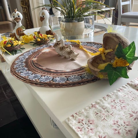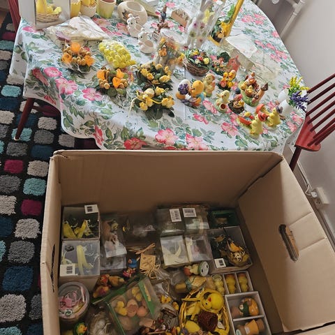 julepynt/påskepynt blandet dekorationer. Kassen indeholder forskellige typer juledekorationer og ophæng i blandede farver og materialer, herunder nisser, figurer og anden sæsonpynt til brug i hjemmet i juletiden. Velegnet til dekoration af bord, vindueskarm, reol eller juletræ afhængigt af de enkelte dele i samlingen.
