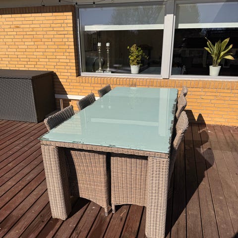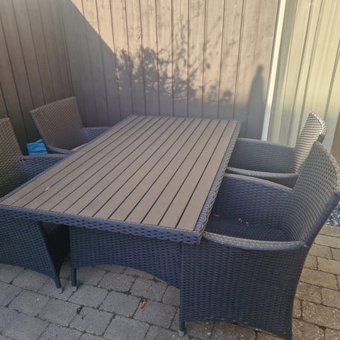 Havebord med rektangulær glasplade og tilhørende 4 havestole. Bordet har lys metalramme og buede ben, mens glaspladen er mørk. Stolene er i grå flet med armlæn i lyst trælook og metalstel, og de har høj ryg. Sættet er egnet til brug på terrasse eller altan som spise- og hyggeområde udendørs.