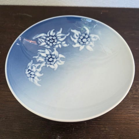 Royal Copenhagen skål i hvidt porcelæn med blå dekoreret kant. Skålen måler ca 4,5 i højden og 17,7 i diameter .