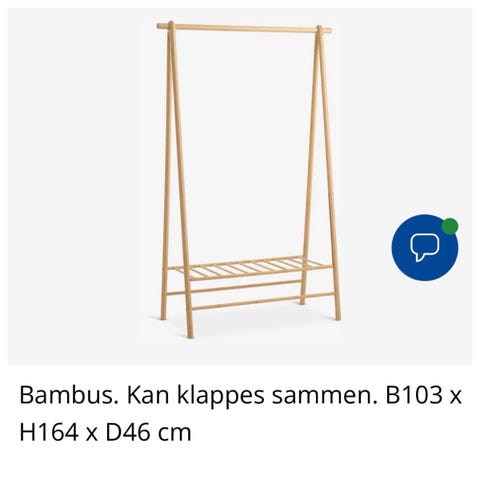 Bambus tøjstativ med minimalistisk design og justerbare hylder, ideelt til opbevaring og udstilling af tøj. Naturlig træfarve.- Bemærk at mail, chat og beskeder ikke besvares, og varen skal købes på knappen "Gå til varen". Efter reservering af varen har du 10 dage til at afhente den i den butik, varen er på lager i.