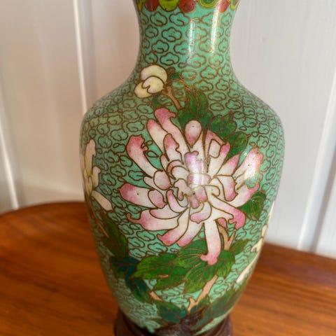 Grøn keramikvase med gylden kant og farverigt blomsterdesign, perfekt til dekoration eller som kunstnerisk centerpiece.