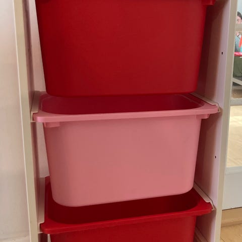 IKEA opbevaringsreol med plastkasser hvid og lyserød