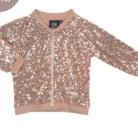 Glitrende pailletjakke designet med klassiske ribkanter og praktisk lynlåslukning. Foret med blød og dejlig bomuld. Festlig cardigan, sommerjakke eller bare til når barnet er vild med glitter palietter og glam. Skøn bomber jakke. Str 116 6 år