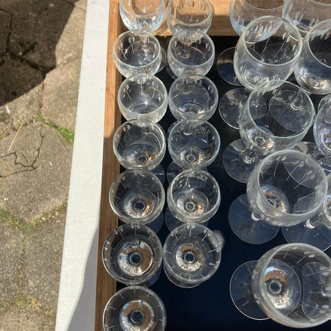 Holmegaard glas på fod i klart glas. Glassene har en rund form med kort stilk og fod, samt indgraveret mønster rundt langs siden. Velegnet som vandglas, dessertglas eller til andre kolde drikke ved borddækning i køkken og spisestue.