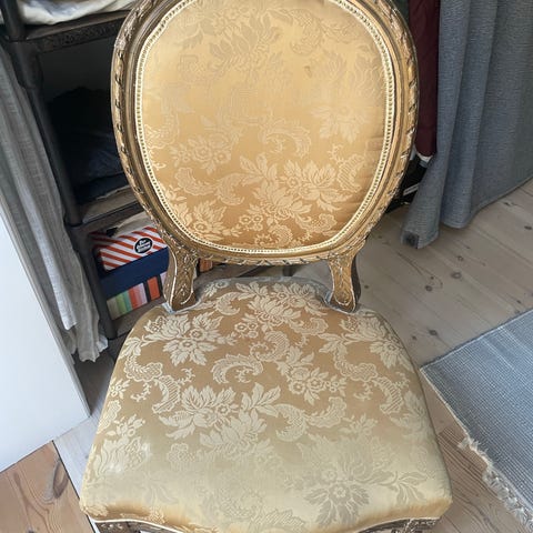 Stolens ramme er lavet af træ med udkårne detaljer.