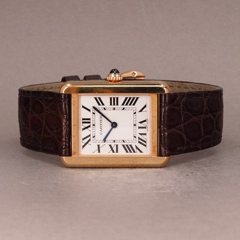 Klassisk Cartier Tank i et tidløst design med hvid skive og romertal. Modellen er kendt for sine rene linjer og elegante proportioner, som gør den velegnet til både hverdag og formelle anledninger.