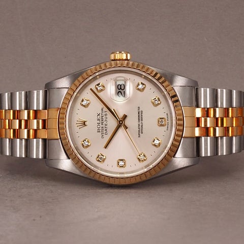 Et flot eksemplar af den klassiske Datejust-model i 36 mm, udført i stål og gult guld. Uret fremstår med en elegant champagnefarvet urskive med fabriksmonterede diamanter samt diamantsat riflet guldkrans, hvilket giver et eksklusivt og harmonisk udtryk.
