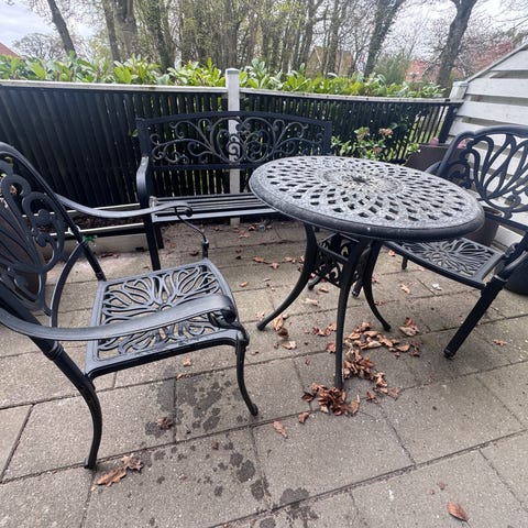 Rundt havebord og matchende havestole i aluminium med dekorativt, gennembrudt bladmønster. Sættet består af et rundt bord og stole med armlæn og høj ryg. Overfladen er lakeret i mørkegrøn farve. Egnet til udendørs brug på terrasse, altan eller i have. Bord og stole har detaljerede ben og stel i støbt metal, som giver et klassisk udtryk. Maling er afskallet flere steder . Lidt rust