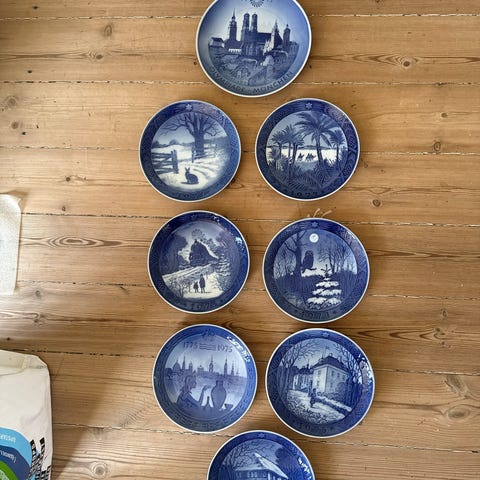 Bing & Grøndahl porcelænsplatter med blå dekoration. Motiverne omfatter blandt andet juleplatter med forskellige årstal samt en platte med olympiade-motiv fra München 1972. Platterne er runde og udført i porcelæn med klassisk blå-hvid dekoration. Egnede som samlerobjekter eller vægdekoration. Antal og specifikke årgange fremgår af billederne.