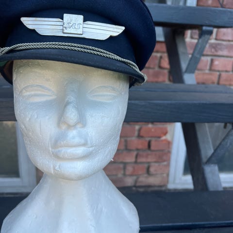 Pilot uniform kasket i mørkeblå farve med guldfarvet vingeemblem foran. Kasketten har skygge og fast form, indvendig foret med glat stof og kant i kunstlæder eller læder. Egnet som del af uniform, udklædning eller samlerobjekt
