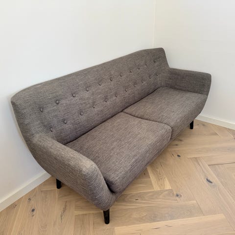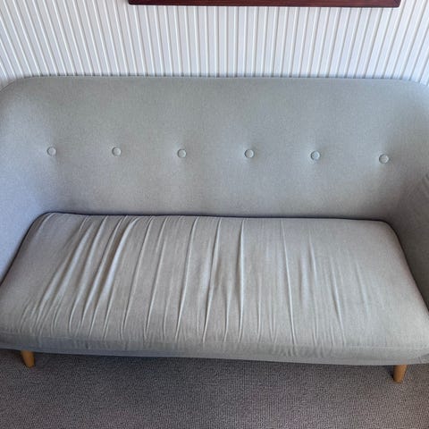 Måler 96 cm længde, 85 cm dyb, 45 cm siddehøjde. Der er enkelte løse tråde (de kan sikkert blot klippes af). Befinder sig i Grauballe, 8600 Silkeborg. Pris: 500 kr