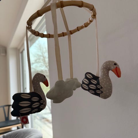 Done by Deer uro med bløde stofdyr i stribede, neutrale farver. Uroen består af en polstret, rund ring, hvorfra flere små dyr hænger i snore. Øverst sidder en blød ophængsdel med indbygget optræk, som kan afspille en melodi. Uroen er egnet til brug over tremmeseng, pusleplads eller kravlegård og er fremstillet i tekstilmateriale med fyld, der giver figurerne en blød og let form. Designet er kønsneutralt med enkle, grafiske striber i lyse og mørke nuancer.