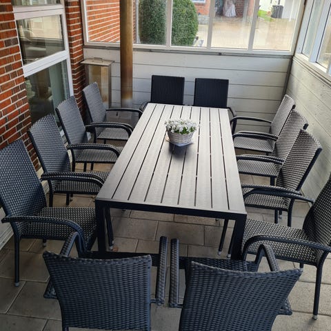 Består af 2 sofaer og 2 stole og 1 bord, samt tykke lækre hynder til 1 sofa og 2 stole 😊