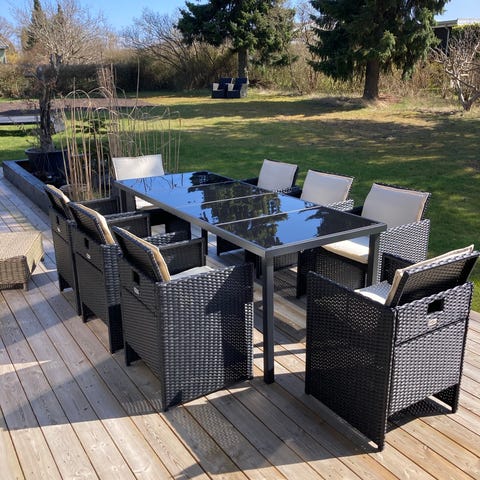 Stort loungesæt til 8 personer i sort polyrattan med bord, sofa og stole.