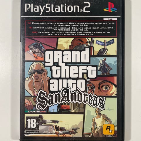 Rockstar Games Grand Theft Auto San Andreas PlayStation 2 spil. Action-adventurespil på DVD til PlayStation 2-konsol. Fysisk udgave i plastcover med trykt omslag og spil-disk. PEGI 18-mærket titel med åbent verden-miljø, hvor spilleren følger hovedpersonen gennem missioner i en fiktiv amerikansk delstat. Spillet kræver PlayStation 2-konsol for at kunne afspilles.