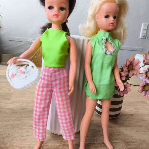 To retro Sindy Barbiedukker med drejetalje og knæk i benene - den lyshårede Sindy er i pæn stand - flot hår og intakt knæk i begge ben, den mørkhårede Sindy har muligvis været hos frisøren ;-) dukken har kun intakt knæk i det ene ben og hun mangler en lillefinger på den ene hånd. Tøjet dukkerne har på følger selvfølglig med - dukkerne sælges samlet og prisen er for dem begge to.
