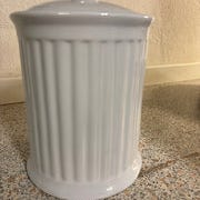 Hvid keramikbeholder med tætsluttende metalklips og håndtag til opbevaring af madvarer. Ideel til køkkenet eller som dekorativ detalje.