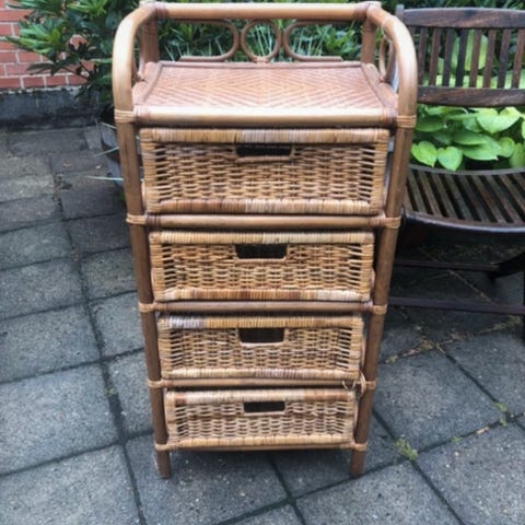 Er rigtig fint, dog er der en skuffe hvor flettet er gået lidt i stykker. Derfor den billige pris. Mål: 75 cm høj, 45 cm bred, 35 cm dyb. Befinder sig i Grauballe/Gødvad, 8600 Silkeborg. Pris. 150 kr