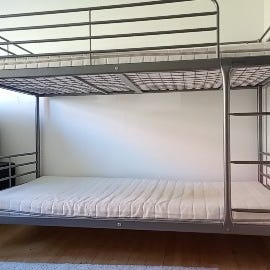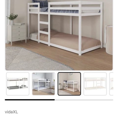 FLEXA køjeseng i træ med hvid overflade. Sengen består af træramme, ben, sengeheste og stige, som kan samles til en køjeseng med to liggepladser. Leveres med beslag og skruer som vist på billederne (nogle af skruerne mangler, men kan nemt erstattes). Nogle af lamellerne i den ene seng skal have nye gummiindlæg for ikke at falde ud. Egnet til børn.